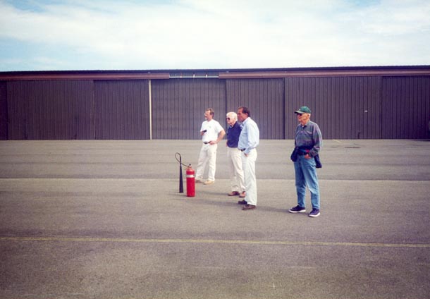 These photos show the initial roll-out and the initial engine start that was successful except for a fuel shut-off valve leak that was subsequently corrected. Incidentally, the fuel shut-off valve is of extraordinary quality. John Dimmer owns a machine shop and had a new cone for the valve machined from Teflon - perhaps the only one in the world - that will likely last forever. The original cone was of course made of cork.